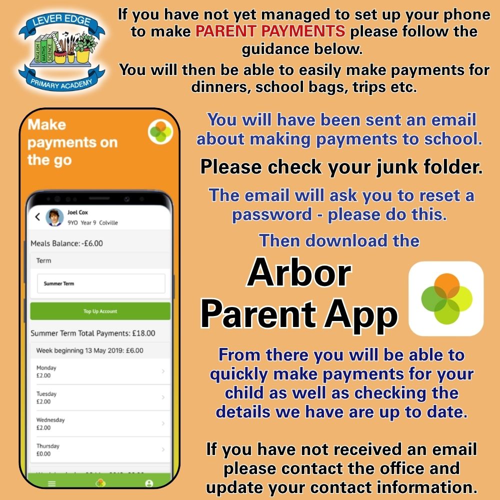 Children in Year 3 - Year 6 who have a school meal can pay via the Arbor Parent App. Instructions for parents on how to do this will be added